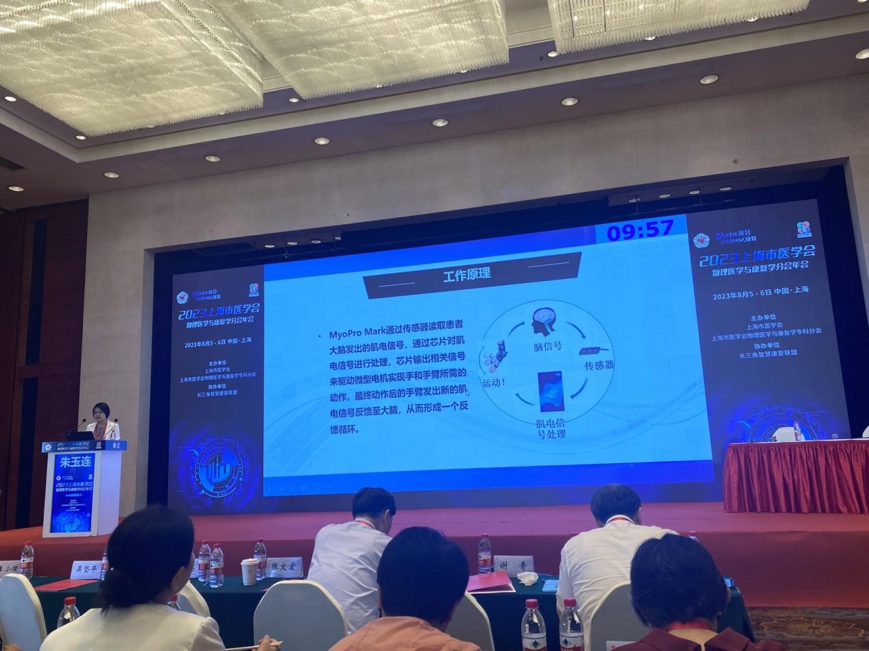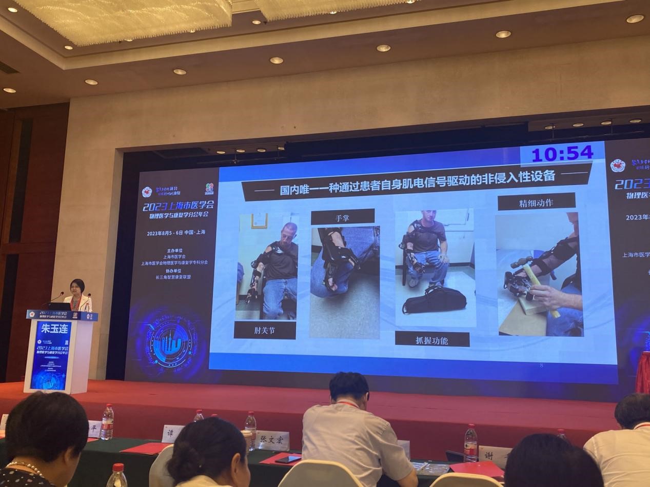 会议围绕“聚焦多学科融合 引领新时代康复”这一主题,特别邀请康复领域的临床专家、华山医院的朱玉连教授进行了长达15分钟的专题分享,深度介绍关于我司产品“迈欧缪上肢外骨骼康复机器人”。
